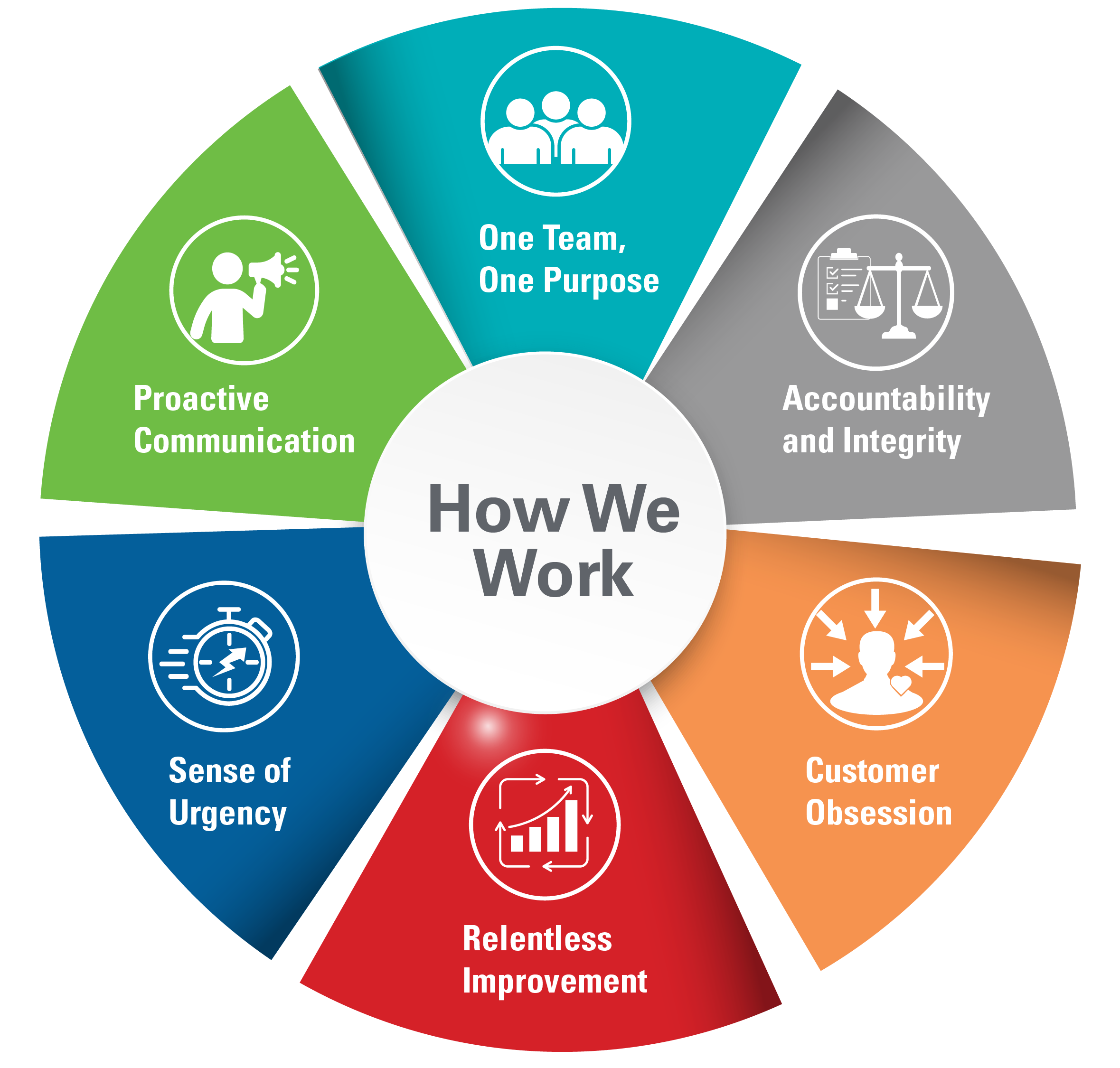 Our core values define how we work together every day—how we collaborate, make decisions, and deliver for our customers. They connect our people, our purpose, and our actions, creating a shared standard across teams, functions, and locations.